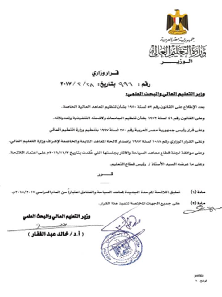 انشاء المعهد بموجب القرار الوزارى رقم 1169 لسنة 1999 ويخضع لإشراف وزارة التعليم العالي والبحث العلمي وفقاً للوائح والقوانين المنظمة لذلك ويمنح المعهد درجة البكالوريوس في التخصصات (الارشادالسياحى،الدراسات السياحية ،ادارة الضيافة ) معتمدة من المجلس الأعلى للجامعات ومعادلة للدرجات العلمية الممنوحة للجامعات المصرية