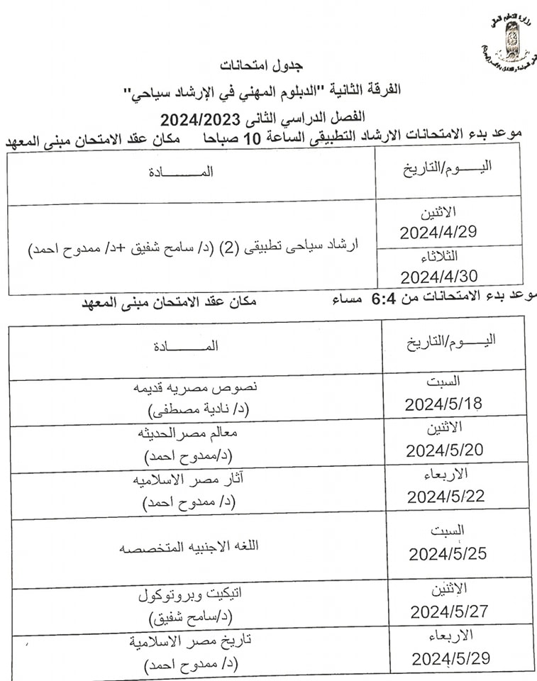 جداول امتحانات الدبلوم المهني في الارشاد السياحى الفصل الدراسي الثاني 2023 / 2024